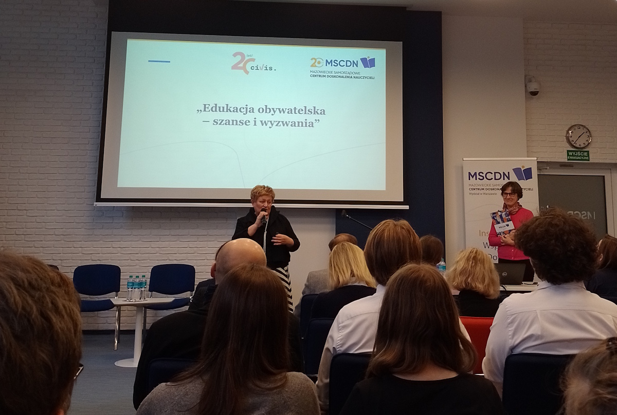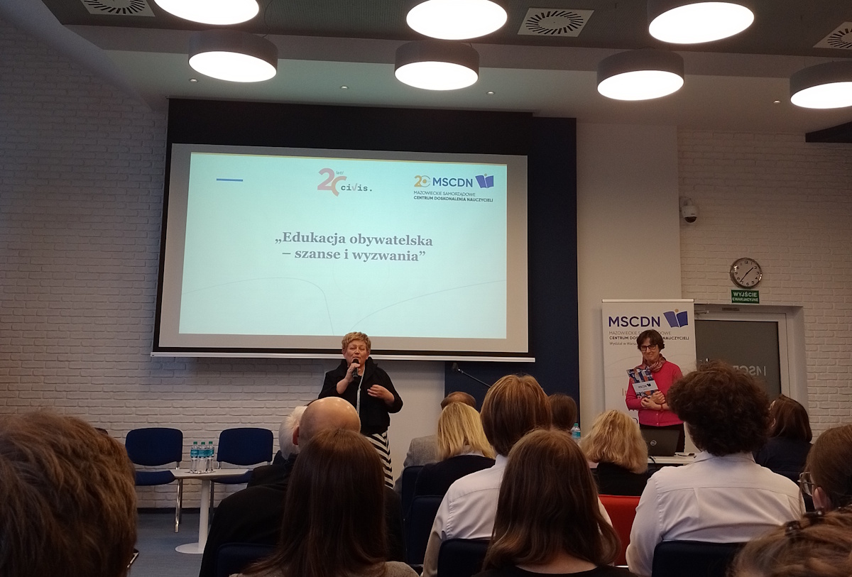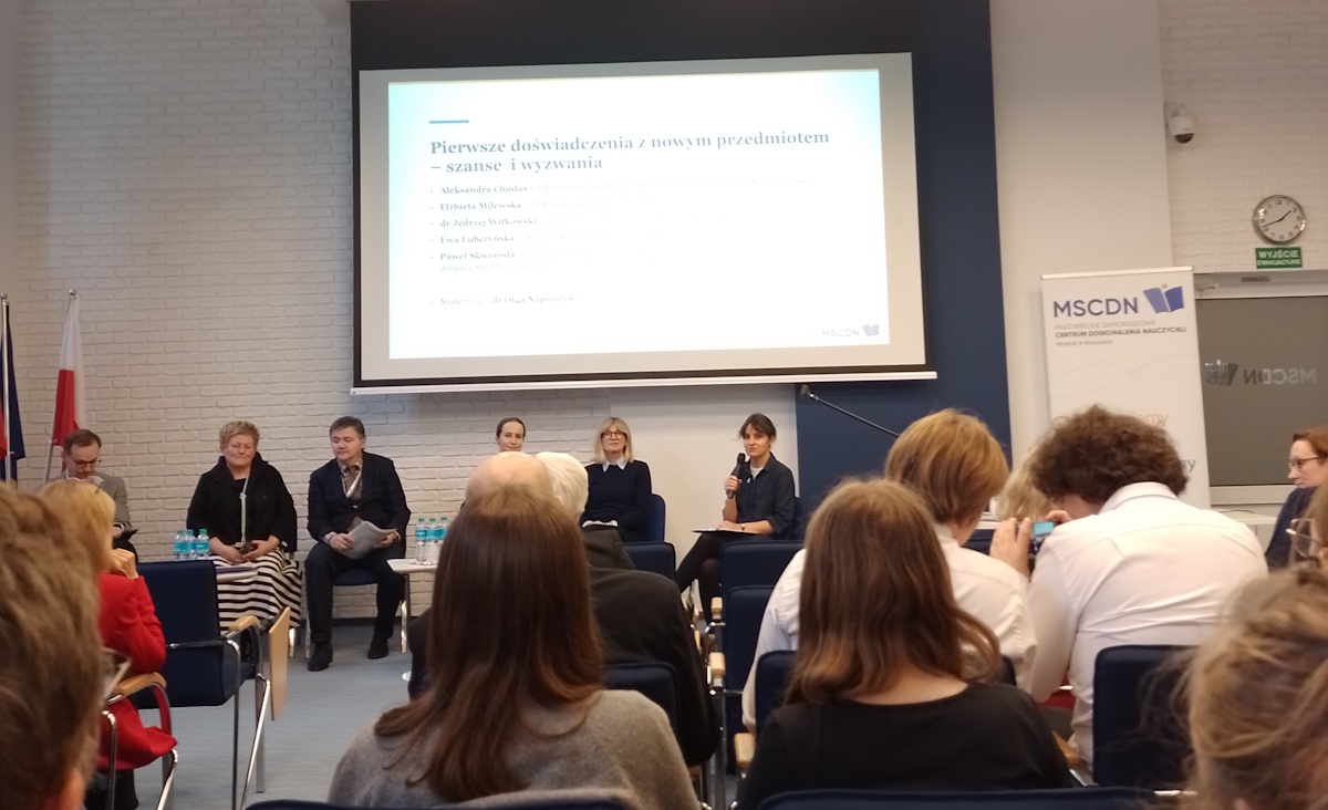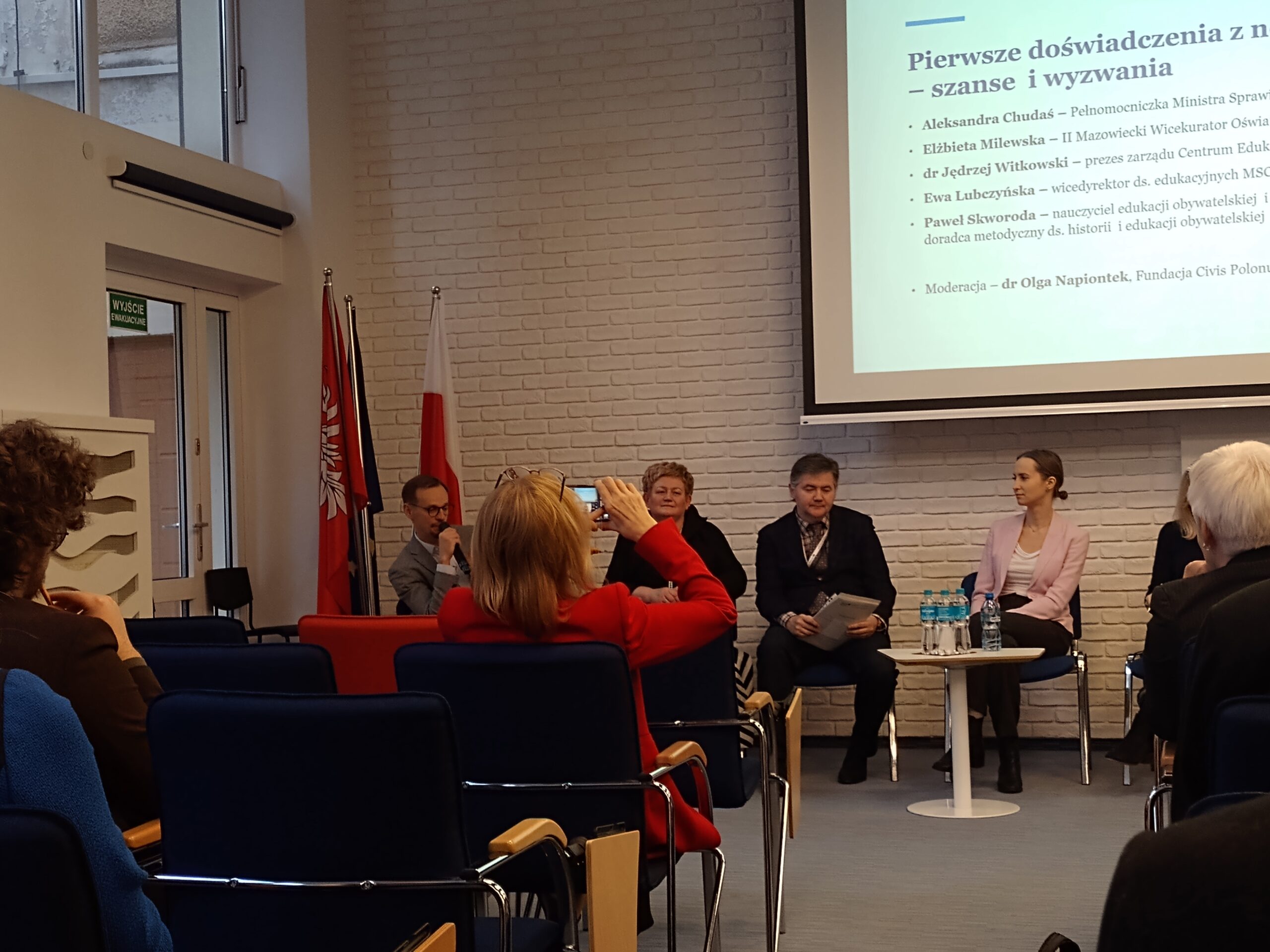 W panelu pt. „Pierwsze doświadczenia z nowym przedmiotem – szanse i wyzwania” wzięli udział: Pani Aleksandra Chudaś – Pełnomocniczka Ministra Sprawiedliwości ds. Edukacji Konstytucyjnej; Pani Elżbieta Milewska, II Mazowiecki Wicekurator Oświaty; Pan dr Jędrzej Witkowski, Instytut Badań Edukacyjnych i prezes zarządu Centrum Edukacji Obywatelskiej; Pani Ewa Lubczyńska, wicedyrektor ds. edukacyjnych MSCDN, Pan Paweł Skworoda, nauczyciel edukacji obywatelskiej i historii w XLIII LO, doradca metodyczny ds. historii i edukacji obywatelskiej. Moderatorką panelu była dr Olga Napiontek, Fundacja Civis Polonus.