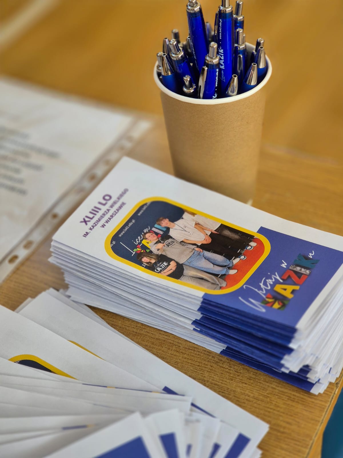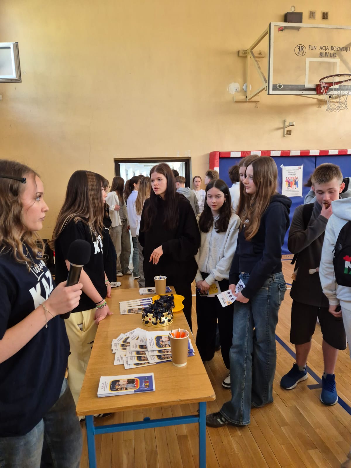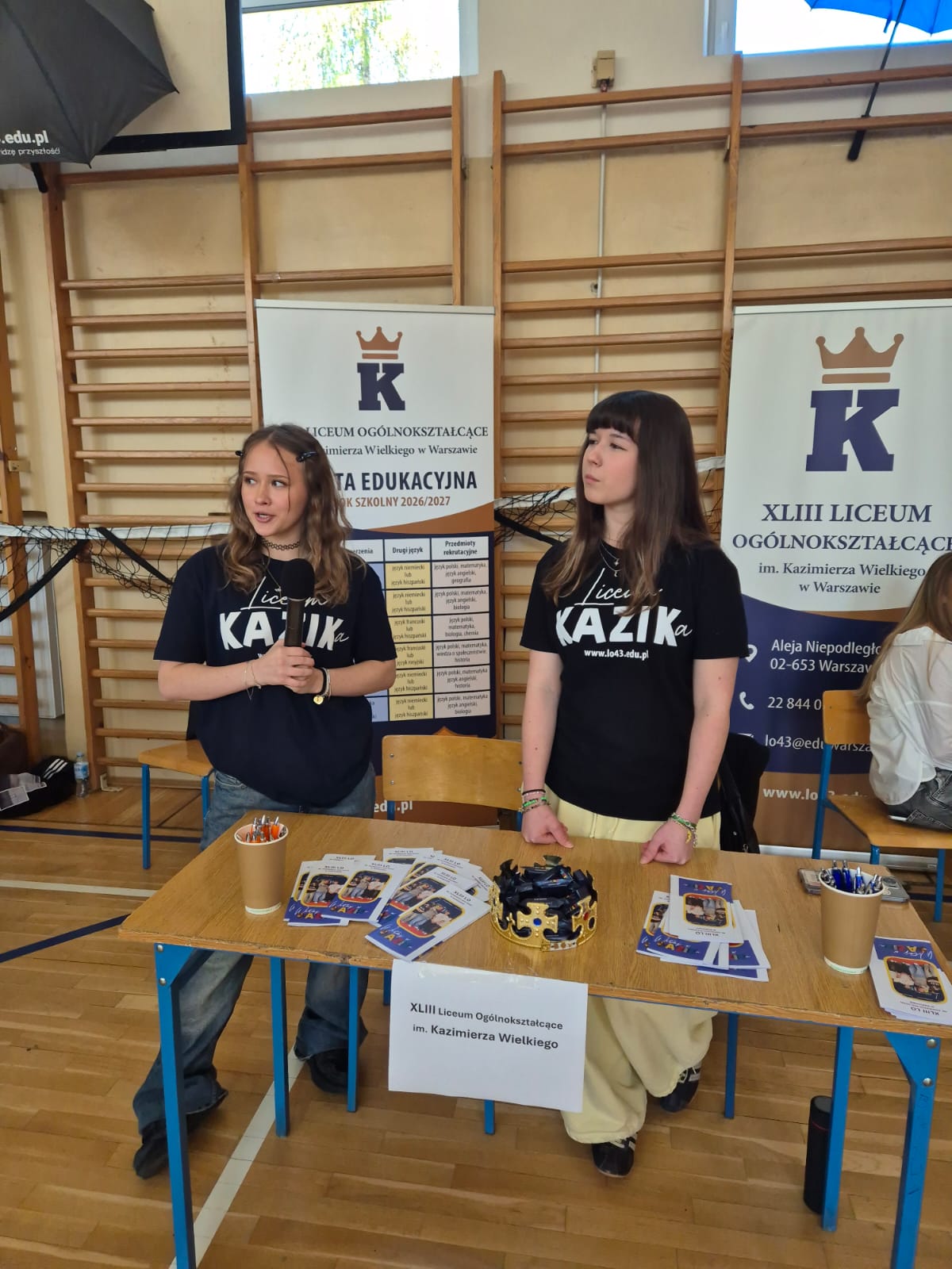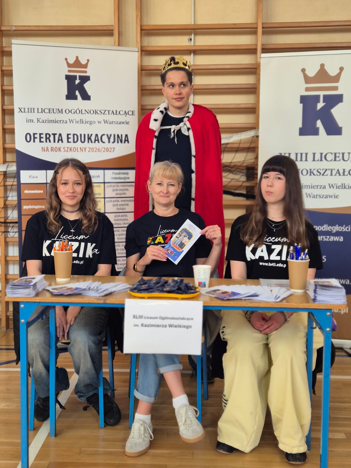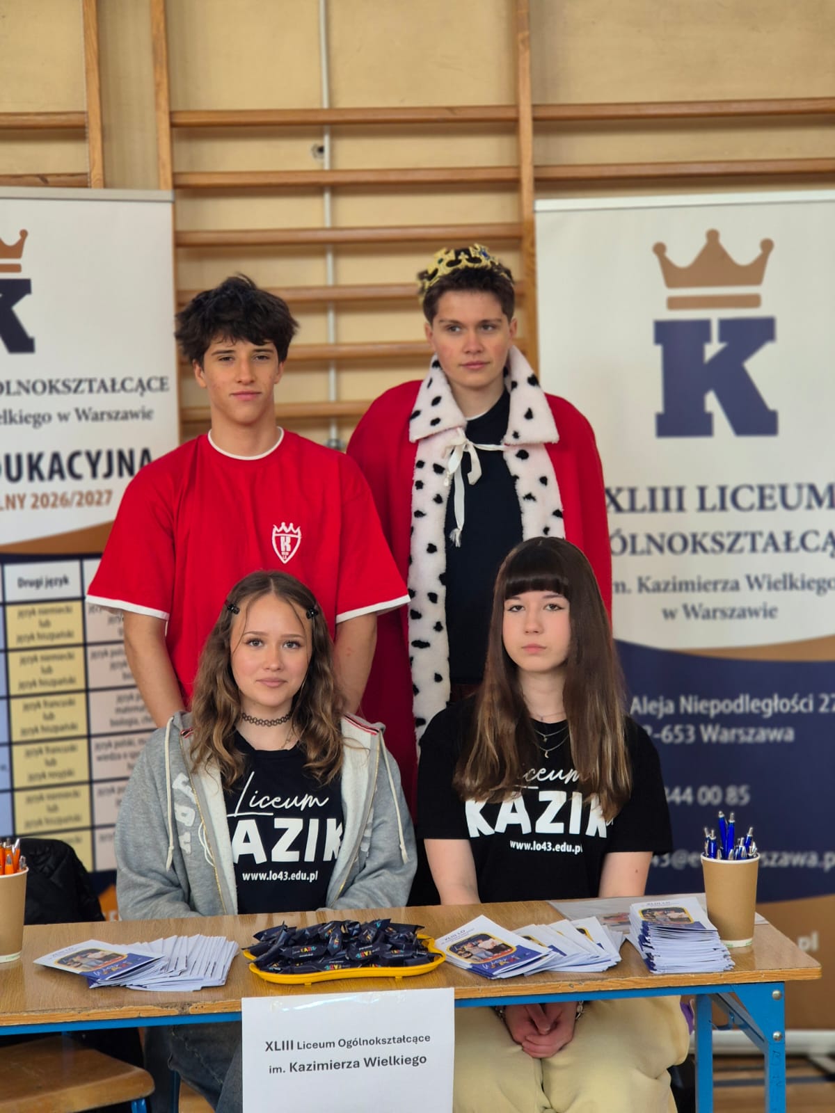 Nasze stanowisko cieszyło się wielkim powodzeniem, a uczniowie: Maja, Julka, Tymek oraz Aleksander godnie reprezentowali barwy XLIII LO. Rozdawaliśmy sygnowane naszym logo cukierki, długopisy, ulotki. Nad całością czuwał król Kazimierz oraz nauczyciele: Katarzyna Goliszzewska-Szadura i Maksym Rogala.